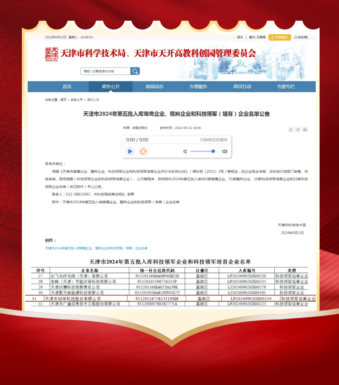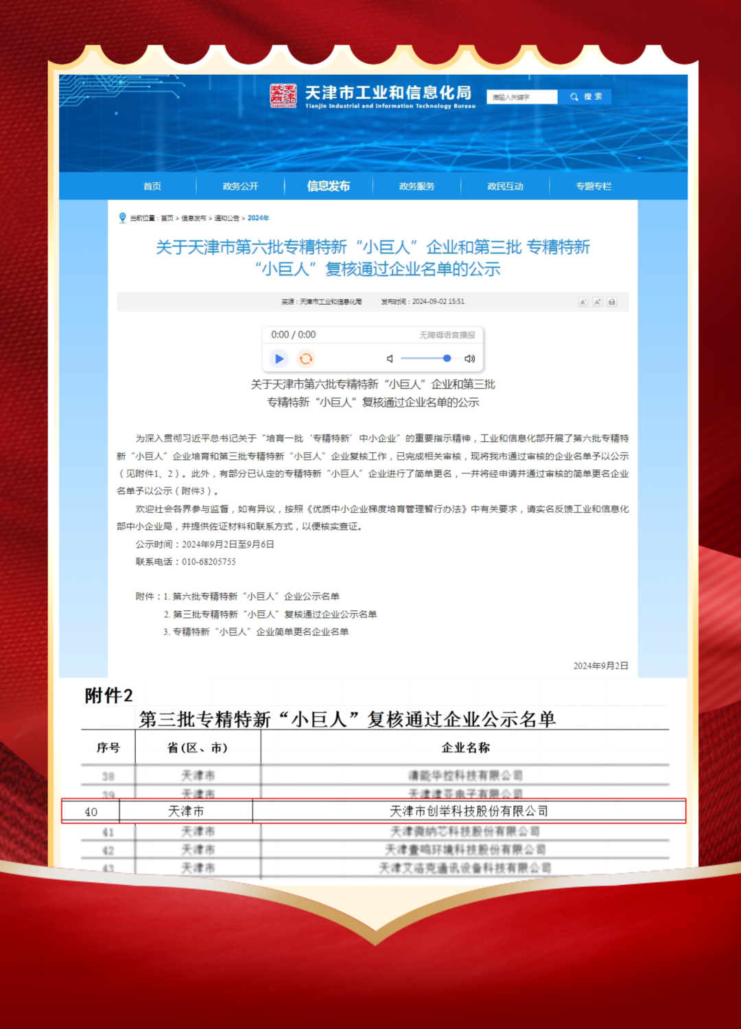 近日,天津市創(chuàng)舉科技股份有限公司(簡稱“創(chuàng)舉科技”)通過國家級專精特新“小巨人”企業(yè)復審,同時入選天津市科技領軍培育企業(yè)名單。